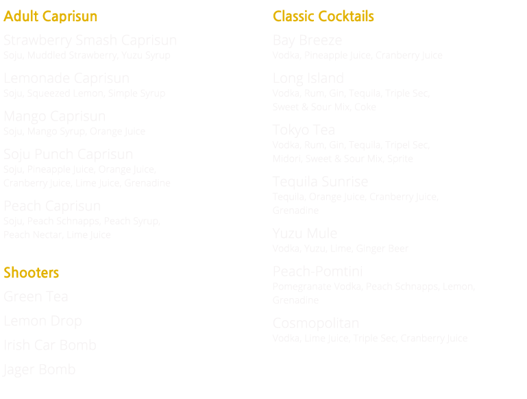 If you require a little “liquid” encouragement, you can enjoy the full size bar to get you in the party mood. Our bar offers over 12 draft beers, various craft beers, Korean liquors, and unique cocktails. You can also enjoy all sports game at the bar lounge area featuring multiple flat screen TVs.